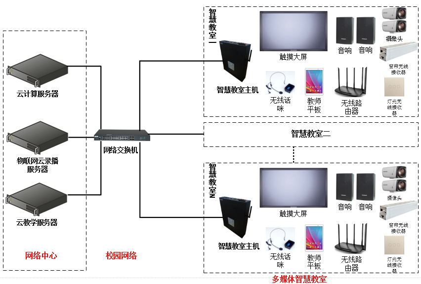 1云教室主机:云教室主机将云终端、中控、功放、实物拍摄及常态化录播主机五个系统高度融合,是所有多媒体智慧教室设备的中枢:云服务器需要通过智慧教室主机提供云桌面、云教学、云录播、云管理等服务;触摸大屏、音响、平板等智慧教室外设需要连接智慧教室主机,形成多媒体智慧教室教学环境;录播摄像头、灯光窗帘无线接收器等物联网云录播系统相关硬件需要连接智慧教室主机,形成多媒体智慧教室管理环境。