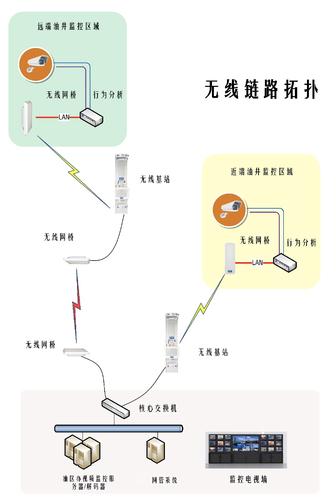 根据在甲方现场调研,应用环境在油区办360度分布着采油设备。了解应用环境为固定方式远程无线视频监控进行使用,采用无线基站,无线网桥覆盖应用场所,覆盖要求满足网桥与基站的链接,应用业务主要以视频为主,在架设的覆盖专网内承接70余个视频监控的应用,基站架设可以灵活、高效的实现数据,视频实时传输,网络稳定可靠、安全保密,同时大大减少施工量和施工难度,降低投入成本,也有效降低了今后的管理和维护成本。