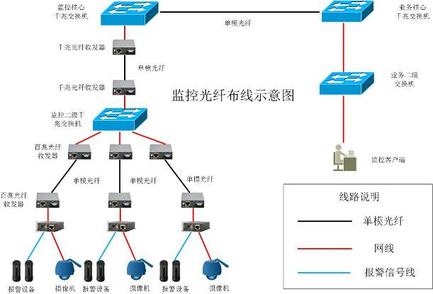 网络布线主要是用于室内监控点、前端网络适配器到监控点接入交换机,以95米为辐射半径,在此区域内的前端监控点均以一台接入交换机为半径接入到二级交换设备上,再通过二级交换设备把网络信号传送到监控中心。