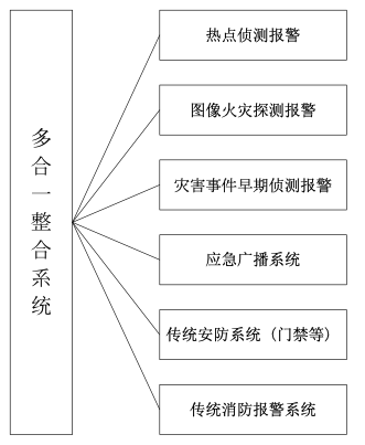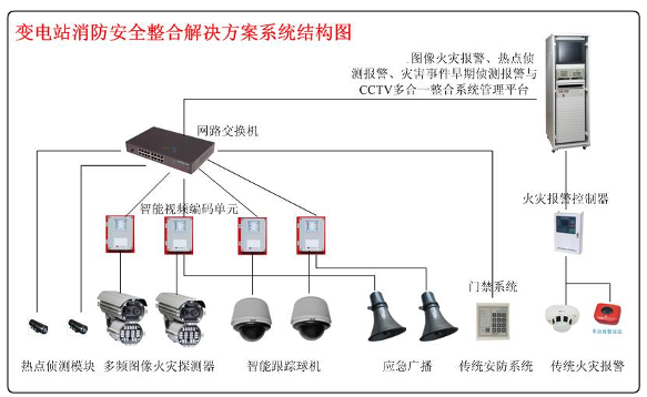 如图所示,在变电站内部署一套多合一整合系统管理平台,前端设备都通过网络接入管理平台,包括热点侦测模块、多频图像火灾探测器、智能跟踪球机、监听与应急广播、传统安防系统、传统火灾报警系统;其中多频图像火灾探测器采用分布式探测技术,输出火灾报警信号的同时,也能输出传统模拟视频信号,再通过智能视频编码单元接入网络;智能跟踪球机通过与之配套的智能视频编码单元接入网络,智能球机在没有被控制的时候回到初始预置位,能够实现智能侦测报警,报警后能联动跟踪报警目标;监听与应急广播系统不仅可以作为日常宣传安全生产所用,报警发生后作为应急指挥的有效手段;传统的消防系统如门禁系统等也能直接接入该管理平台;传统的消防系统如烟感、手报、灭火控制系统接入该平台,能实现报警后的联动响应;自寻的消防炮灭火系统根据需要选择。
