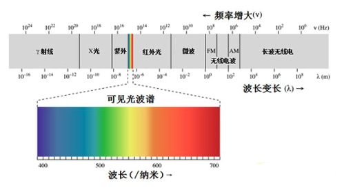 电磁波谱不仅包括可见光图像,而且包括非常丰富的其它电磁波谱,不同频段的电磁波谱在航空航天、工业生产和人们生活中起作非常重要的作用,如下图所示: