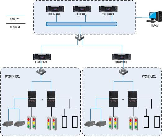 建议主城区、警卫线路区域、绿波协调区域信号机全部采用同一品牌交通信号控制机,交通信号控制系统中心服务器是由中心服务器、数据库服务器、区域服务器、优化服务器和地图服务器组成的服务器群。