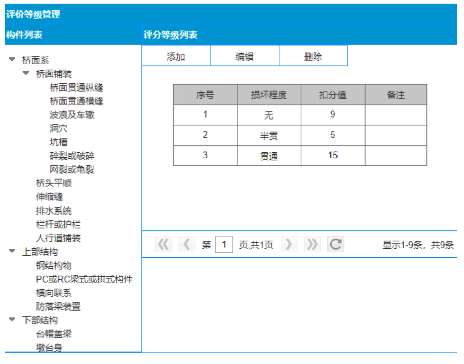 系统具有对每类桥梁需养护的部件进行预设置,并且支持按照重要程度进行分类。