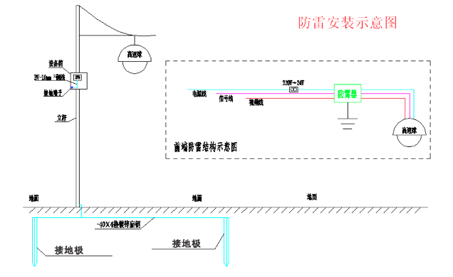 室外雷击途径主要有:沿电源线路、视频线路、控制线路侵入的雷击和过电压,可能会危及摄像机,当金属立杆遭遇直击雷袭击时,其金属杆体往下泄流的瞬间会对其内部的信号线路产生比较强烈的干扰。所以本次项目所在地室外摄像机立杆应做以防雷接地装置。