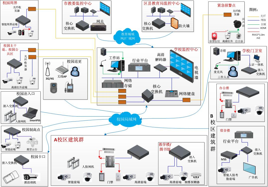 大型应用系统前端接入多个子系统设备,可包括高清视频监控系统、入侵报警系统、车辆管理系统、可视对讲系统、人员通道系统、门禁管理系统、在线巡查系统等,其中若干子系统组成智慧高校系统应用。
