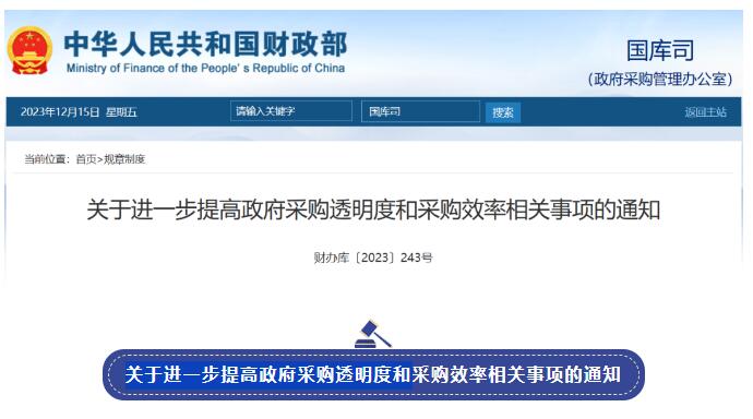 12月14日,财政部发布《关于进一步提高政府采购透明度和采购效率相关事项的通知》(财办库〔2023〕243号),本通知自印发之日起施行。明确: